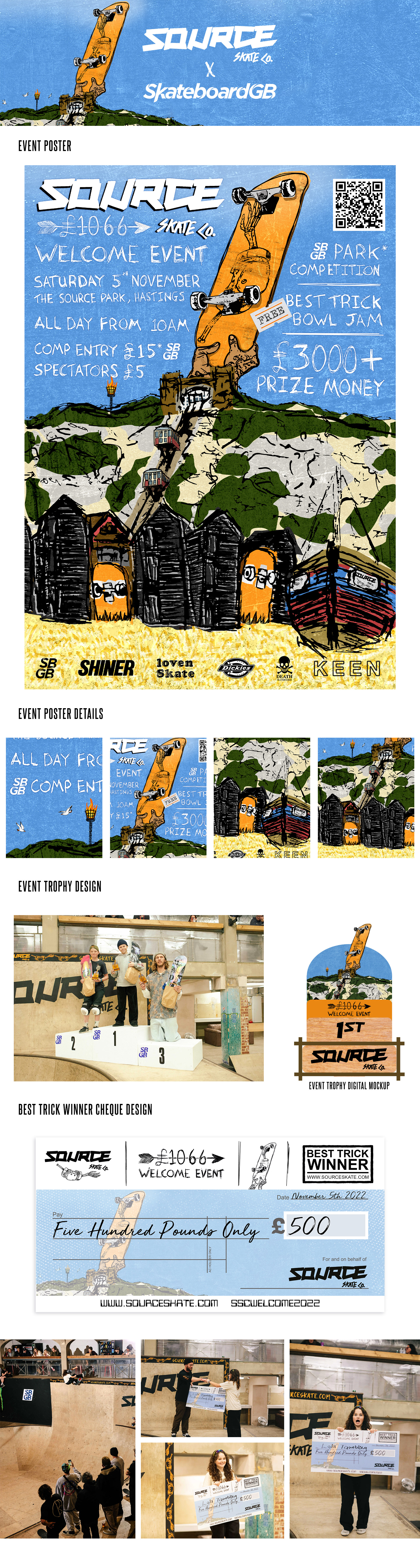 Poster and event branding created for a local skateboarding event in collaboration with Source Skate and Skateboard GB. Alongside the poster, we designed a range of event assets including T-shirt graphics for merchandise, an oversized cheque for the best trick winner, and podium trophies. The visual approach combined hand-drawn illustration and handwritten typography with digital techniques, drawing inspiration from classic Hastings landmarks to create a celebratory, hand-finished feel rooted in local skate culture.